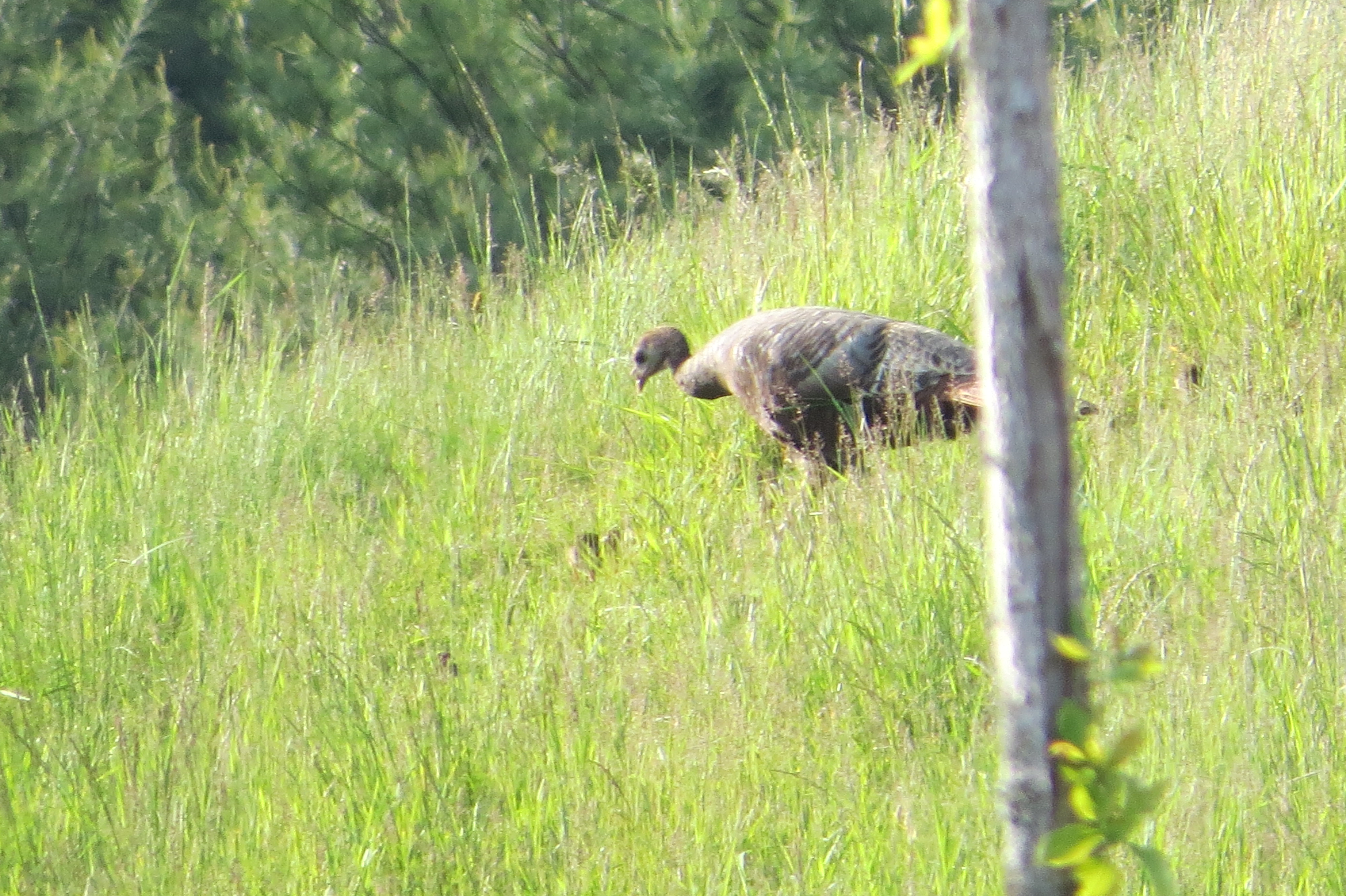 If you look closely you can see the baby turkeys in the tall grass.