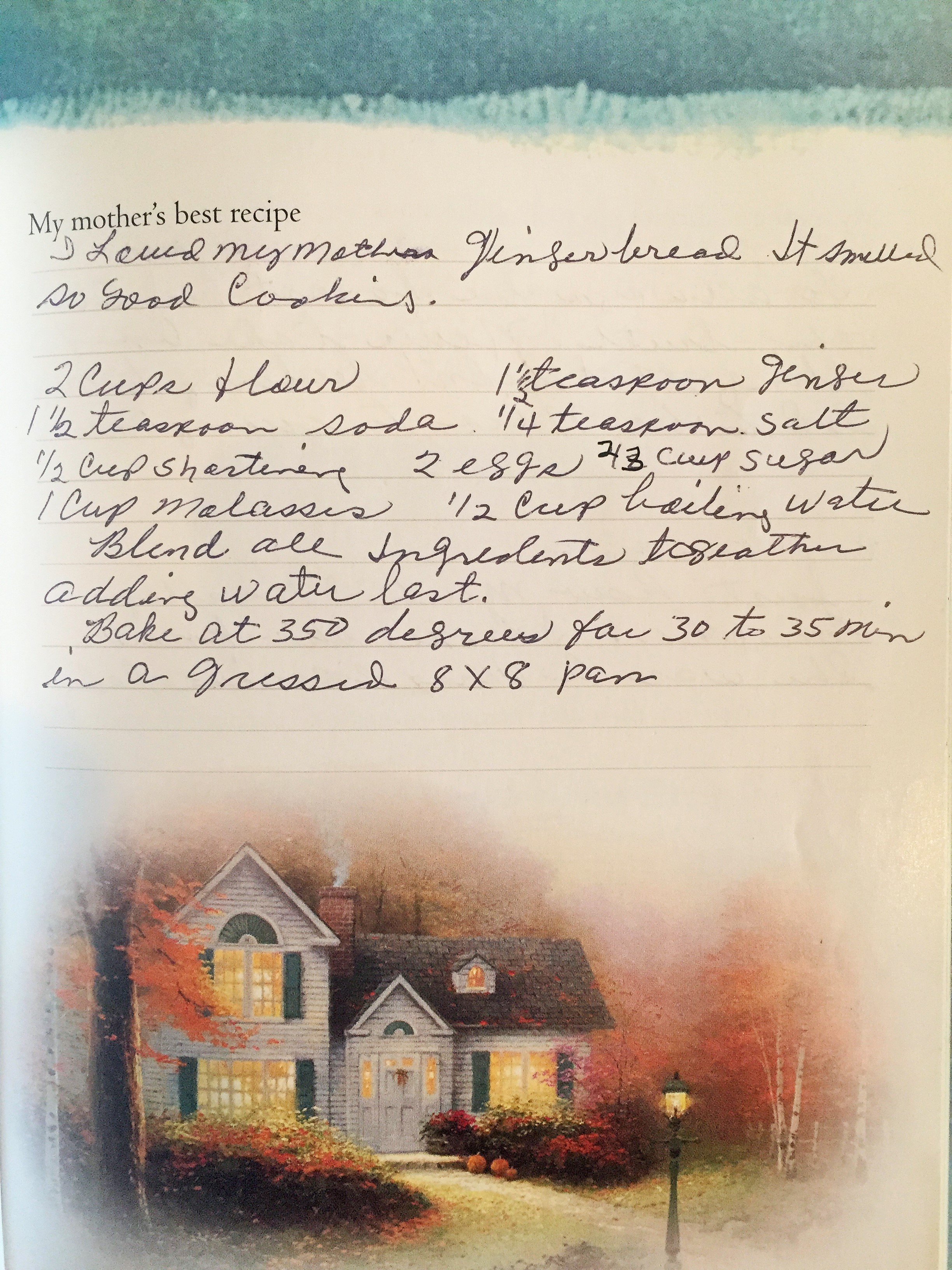 She included her favorite recipe, a simple one, probably from memory. It had been her mother’s recipe for gingerbread, and she wrote about how it smelled as it baked and how that made her feel.